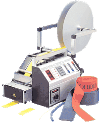 | The above machine is a microprocessor controlled cutting machine designed and manufactured in Denmark. It measures and cuts almost any type of synthetic strip material from thin ribbons to heavy webbings with an electrically heated, compressed air driven knife. An extractor fan is built into the machine for exhausting the fumes generated by the melting material. The machine can measure and cut small or large quantities of strip materials up to125mm wide, in length from 1mm to 99.9 metres and produce consistently accurate lengths and high quality cuts. Frequently used lengths can be stored in the machines memory for instant recall. There are eight memories available for this purpose. The machine is portable and weighs approximately 20Kg. It can be mounted on a table or bench and requires only 230V/50Hz mains socket and a clean, dry compressed air supply.